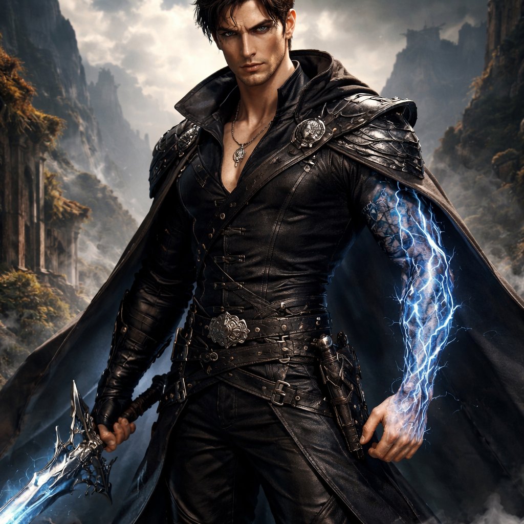 6’5, grey eyes, blacky brown hair, old fashioned fantasy style clothes, a mix of Kai Azer and Xaden Riorson, lighting sl...