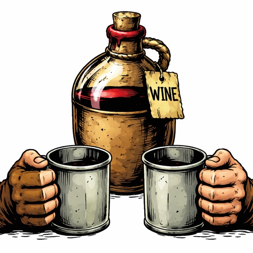 An old jug containing wine. There are two old mugs only we see our hands wrapped around the mugs which are empty
