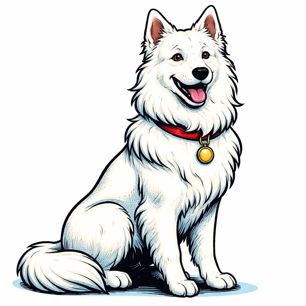 An elegant white dog, seated. three-quarter view