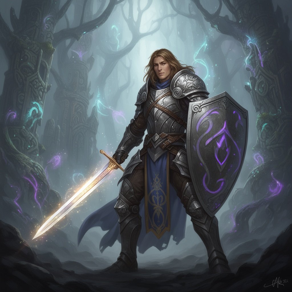 Human warrior holding a huge magical sword point down in front of him. He is covered in spiked armor