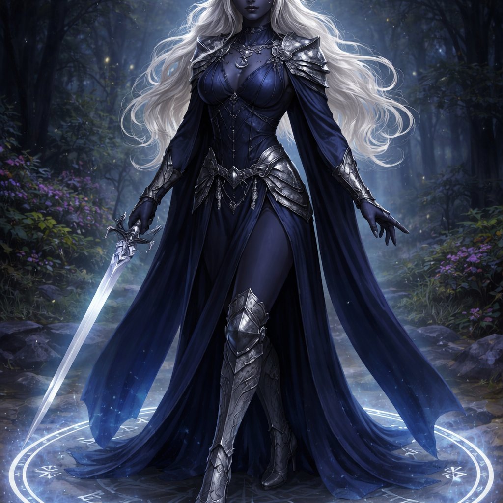 A beautiful Drow woman with long flowing white hair, dark grayish blue skin, large silver eyes, wearing dark blue flowing robes with armor plates, knee high heeled armor boots with Eilistraee’s symbol surrounding her. Full body picture