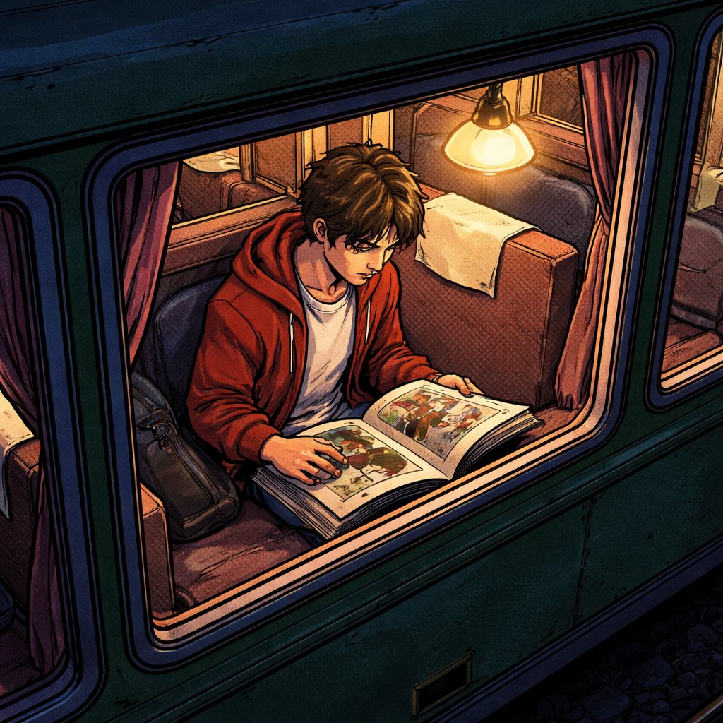 Realistic, refined, no caricature no speech bubbles. A young student about 20 Ish is sitting in the train an old-fashioned train on his lap is a book of art drawings. It is night and the only real light inside is from the train a drone shot view outside the train looking at the fellow reading.
