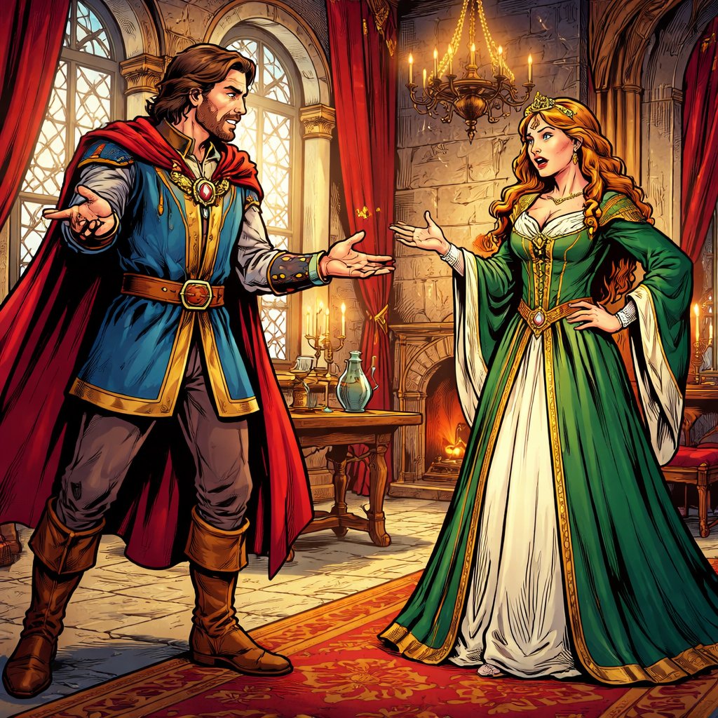 Long shot full body. Each has a different gesture. No finger pointing. Mediaeval noble dressed husband arguing with wife in a castle room