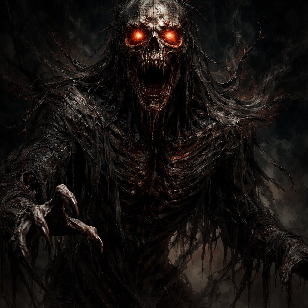 Male ghost , twisted and grotesque form,eyes burning with the same malice that defined his life and a skull for a head. Terrifying and demonic