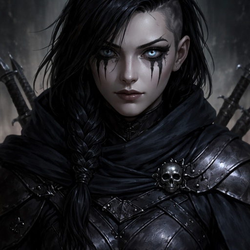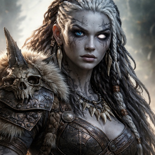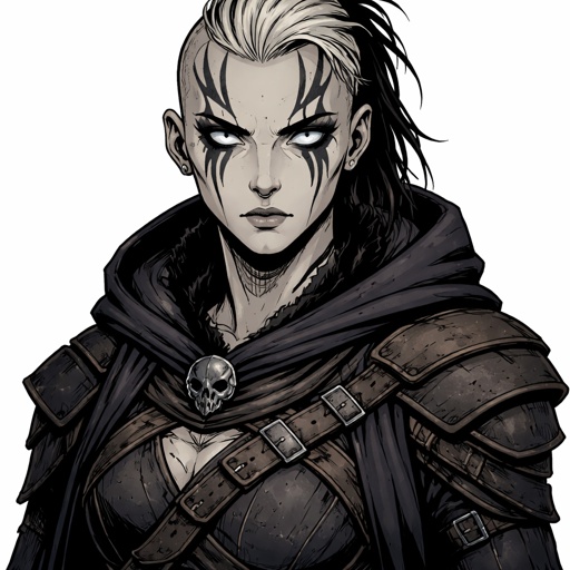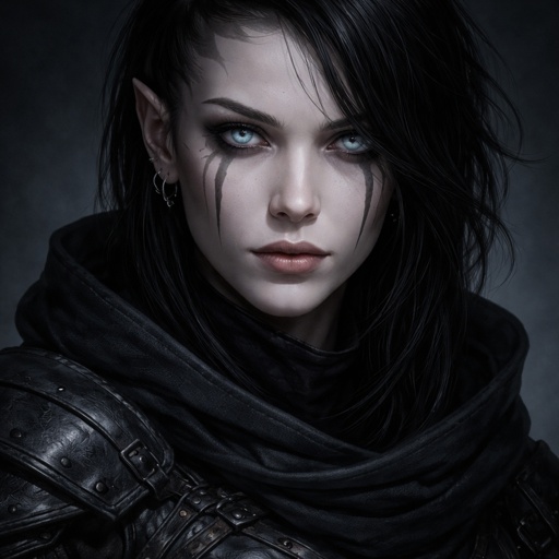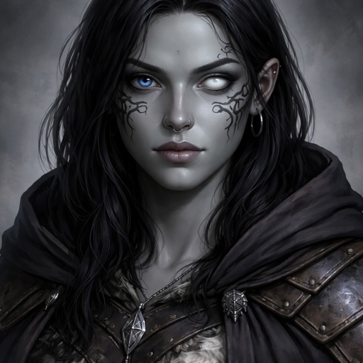 A female goliath from dnd with light grey skin, the right eye is dark blue and the left is almost fogged over (she is blind in the left eye). Her har is black and she is a rouge. She has two tattoos that start at a point under her eyes and goes up to her her and then twists down to her back around the legs to the toes but you only need to generate her portrait (as in mostly her face and a bit of her torso). She is 20 and wears a bit more clothes, she is probably wearing a cloak but the hood is not up and she looks a bit androgynous