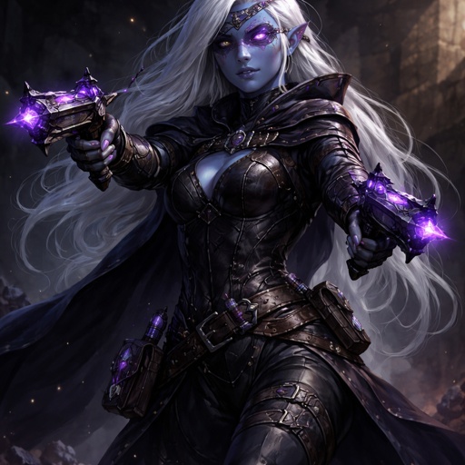 A female drow with blue skin and white hair. She wears sleek lightweight adventurers gear and wields dual hand crossbows...