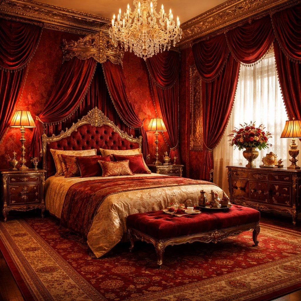A bedroom full of red and gold