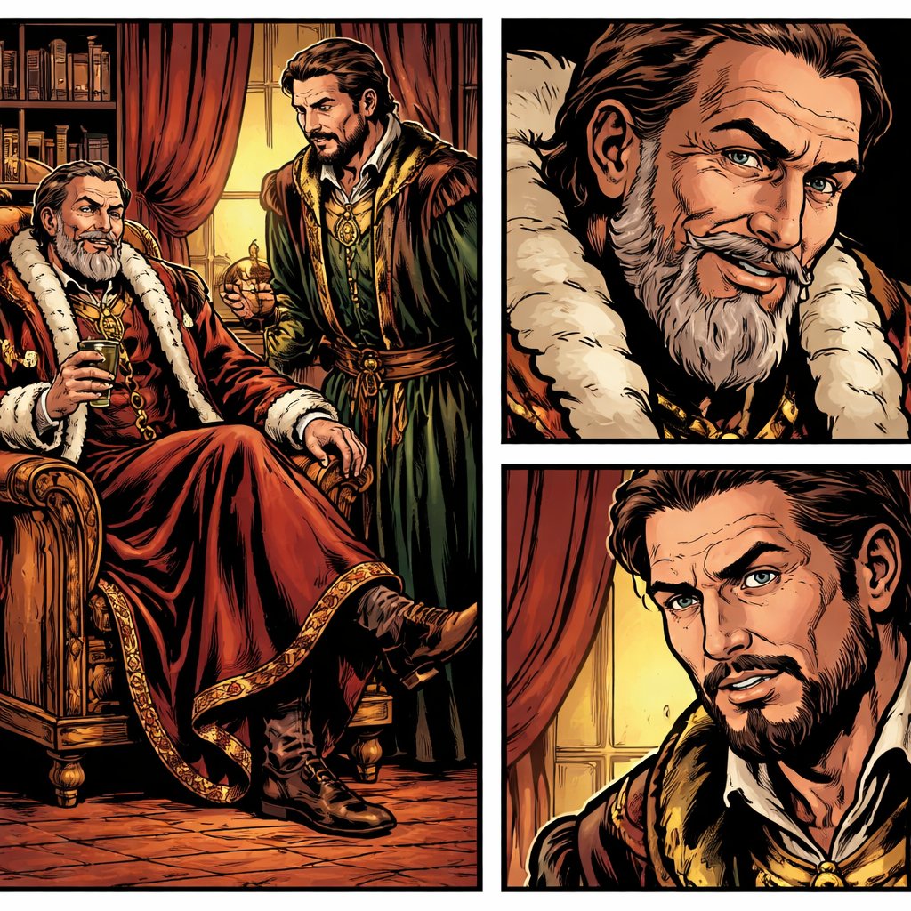No caricature no speech bubbles very rich man and Renasant robe is sitting in an easy chair. Another man stands beside him, also in Renaissance robe and they are having a discussion panel one next panel close-up of the head of one and close-up of the head of the other talking to each other