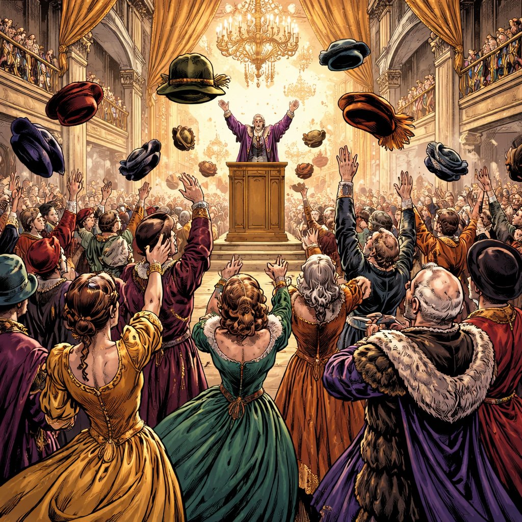 No speech bubbles. Realistic, refined, no caricature an elegant ballroom. We see a group of old and young men and women in renaissance costumes. They are wildly, throwing their hats and cheering cheering someone at a podium. We see them primarily from the rear.
