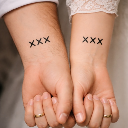 husband and wife tattoos 3 cross’s wedding rings on fingers