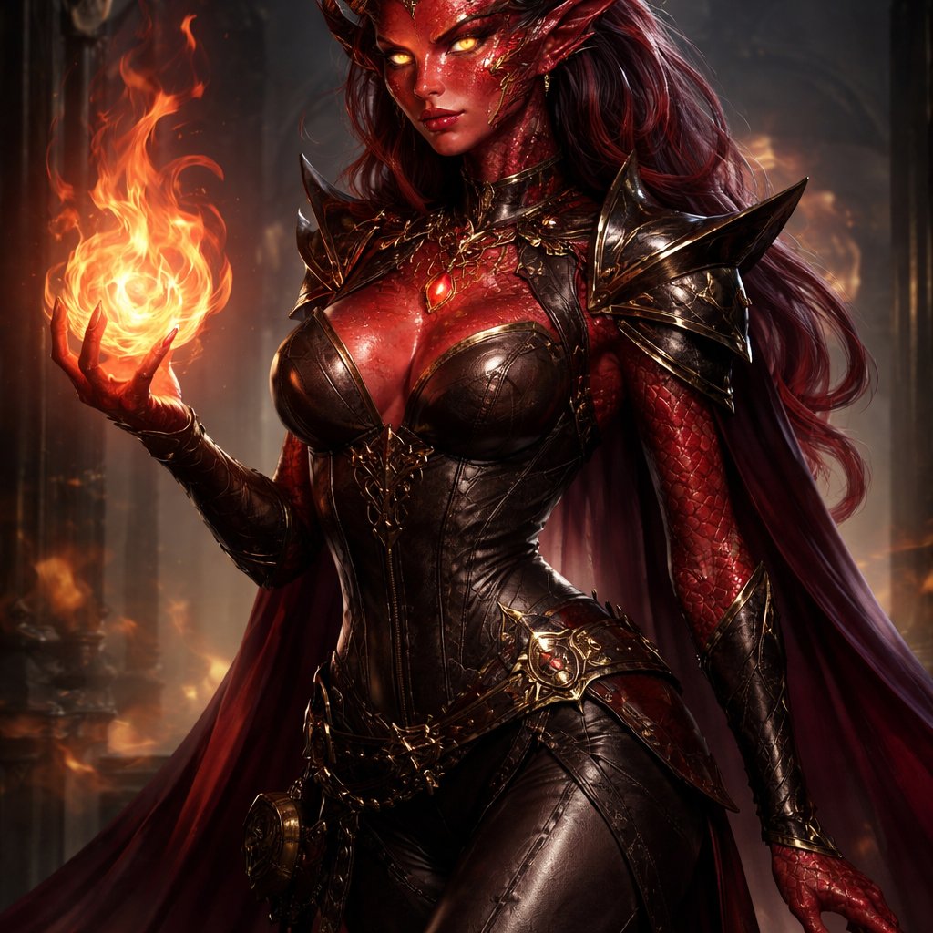 a deceptive dnd red dragonborn sorcerer lady wearing tight clothes