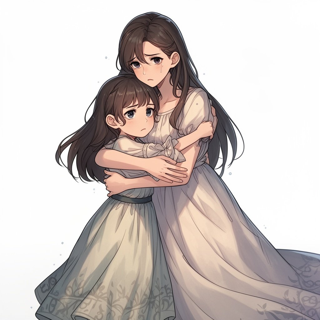 woman and her 9 year old daughter, looking sad, not crying, D&D, in the style of a manwa full color, No background, hugging, in dresses