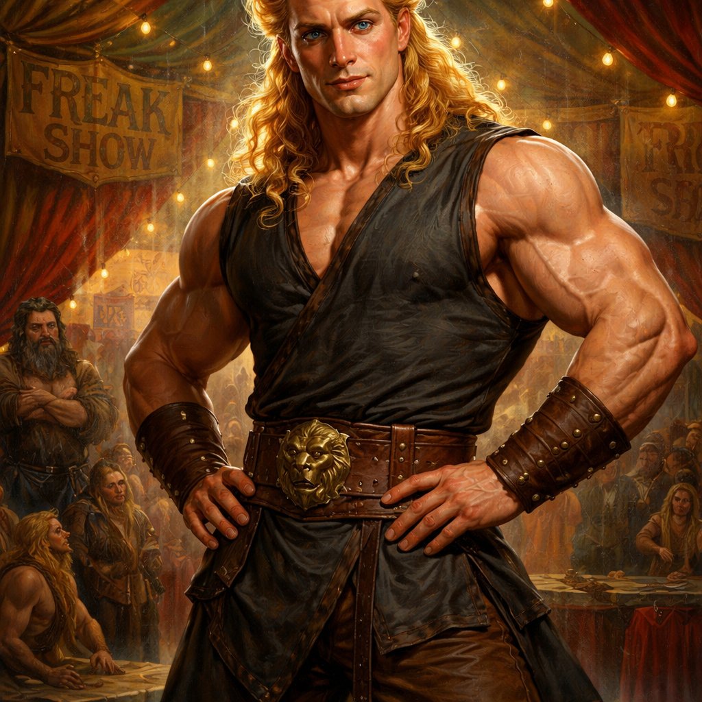 A tall well~proportioned male, so handsome he looks like a Greek god with muscles. With deep-set blue eyes and strong brows, hinting at inner depth“. His hairstyle is a blonde mullet. He works at freak show as a strong man. His outfit consistsed of a Charcoal-toned sleeveless tunic, thick leather belt, leather wristbands/cuffs, brown pants.