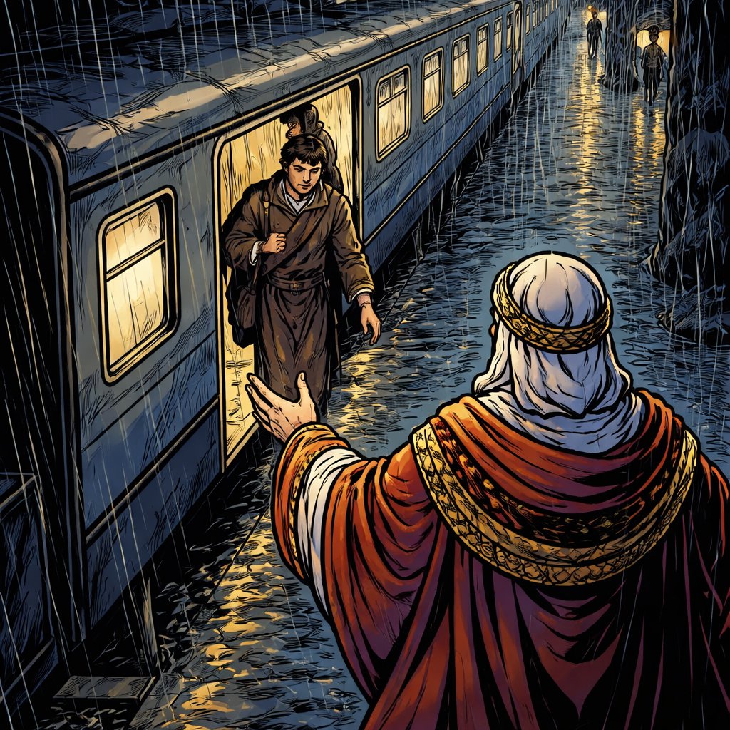 A graceful person in a Renaissance robe is greeting a young man in a plane robe getting off a train. It is dark and rain...