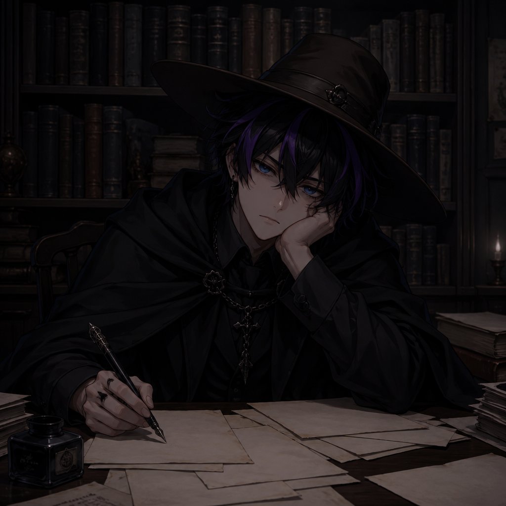 An 18 year old boy who has black hair with purple stripes and blue eyes. He is wearing all black and a black cape. He is wearing a big brown on his head. He is sitting at a desk. Behind him is a big shelf of books of all different sizes. There are blank sheets of paper that cover his desk. He is holding an ink pen in his left hand. He looks bored and tried. The room is dark and has little light.