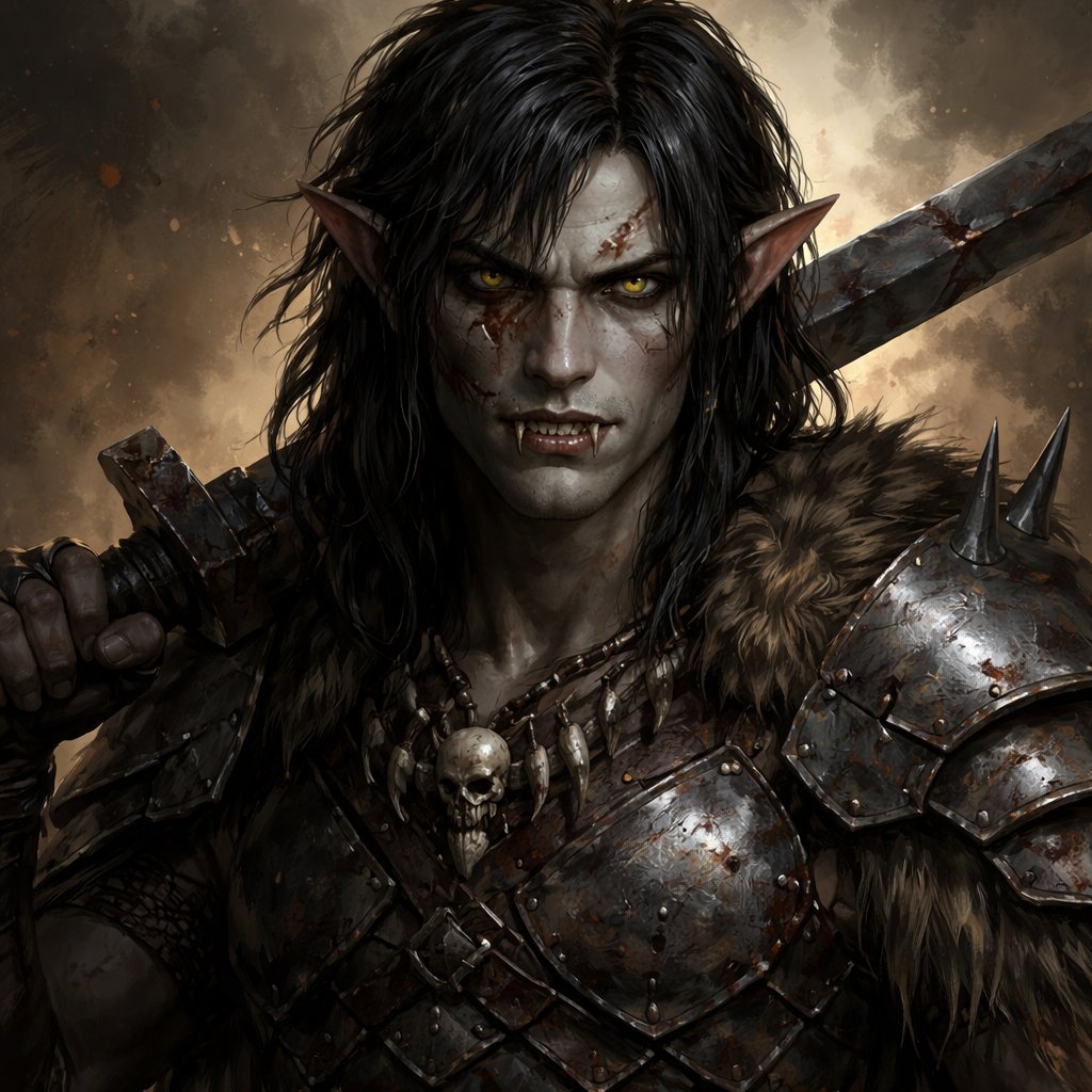 Gerate me a Lord of the Rings Charakter, he will be a half elven, Half Uruk-hai character, male, black Hair and Fangs, h...