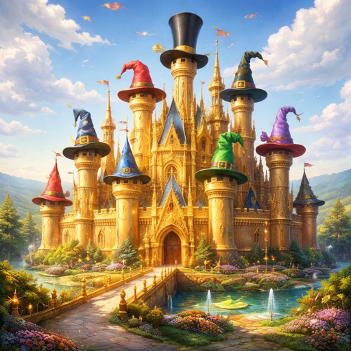 A gold castle with hats on
