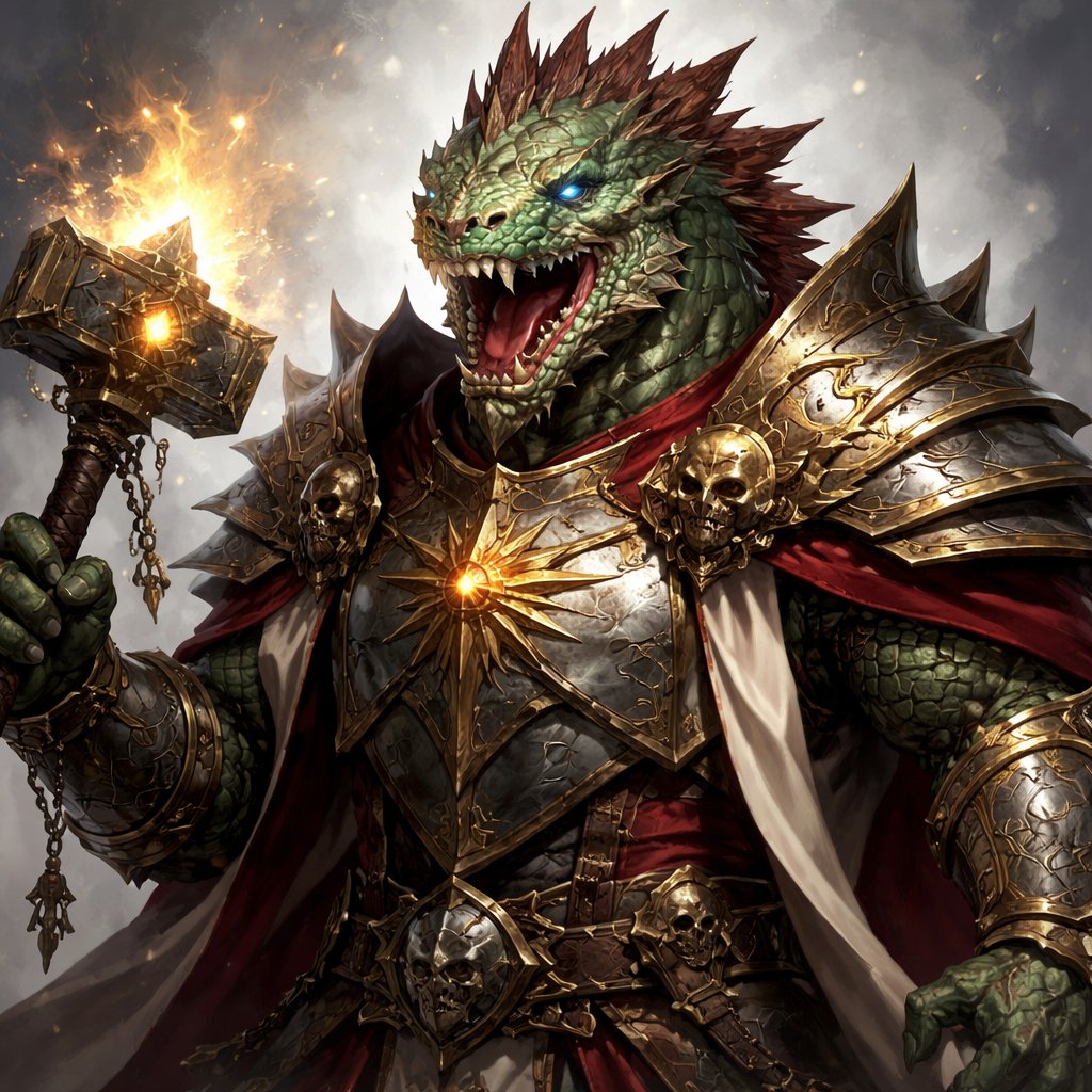 Green Dragonborn dorsal sail, bald, blue eyed, Cleric, fanged maw, Warpreist
