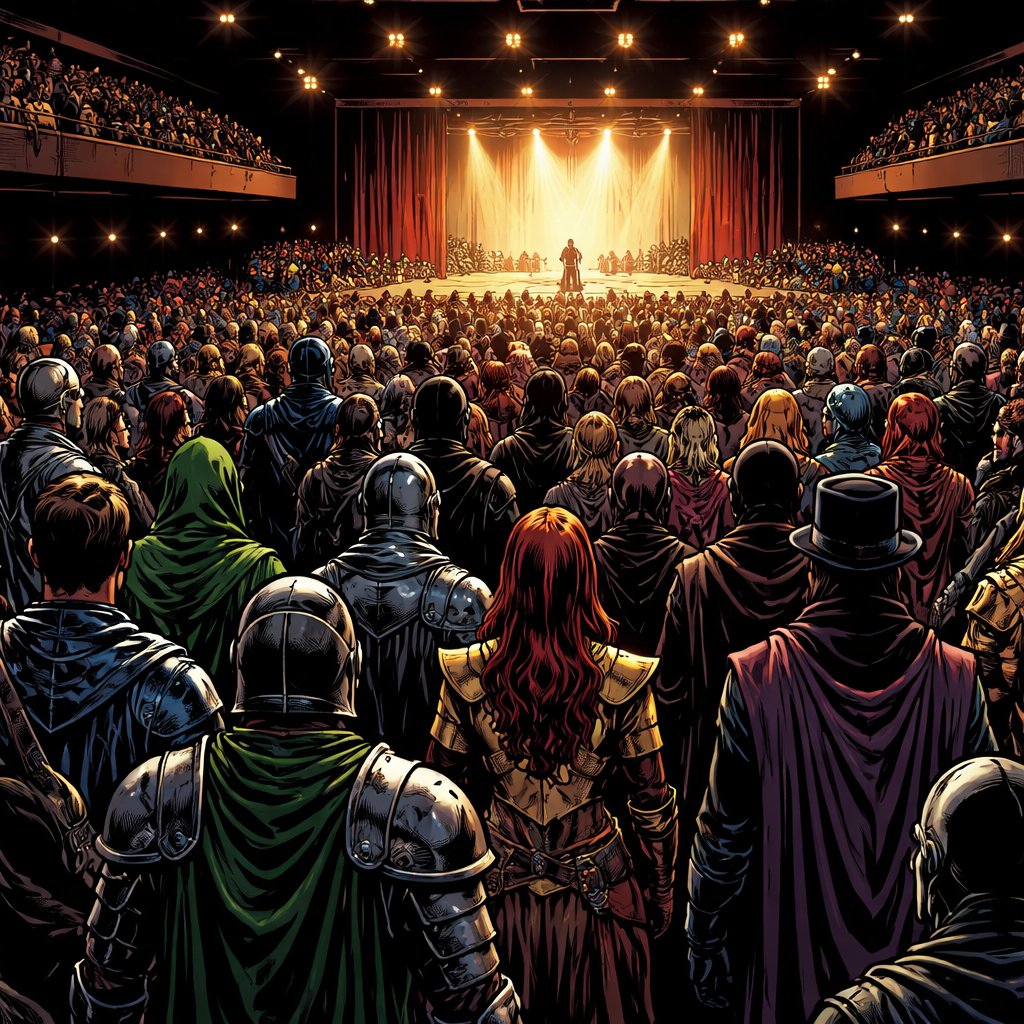 Realistic, refined, long distance shot of a grand procession of people in wildly different costumes inside an auditorium. It is very dark we see only their backs as they’re facing the stage.