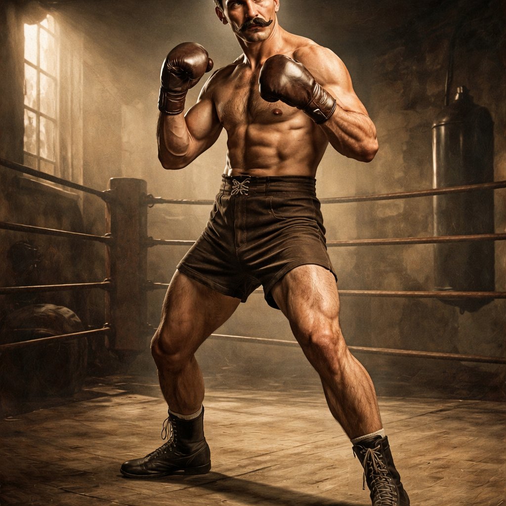 Mężczyzna o długich, ciemnobrązowych, falowanych włosach. Mocnym zaroście na brodzie i wąs. Bokobrody. Wąs wywinięty do ...