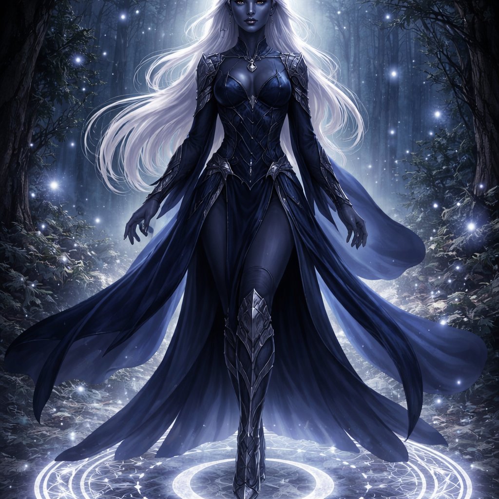 A beautiful Drow woman with long flowing white hair, dark grayish blue skin, large silver eyes, wearing dark blue flowing robes with armor plates, knee high heeled armor boots with Eilistraee’s symbol surrounding her. Full body picture