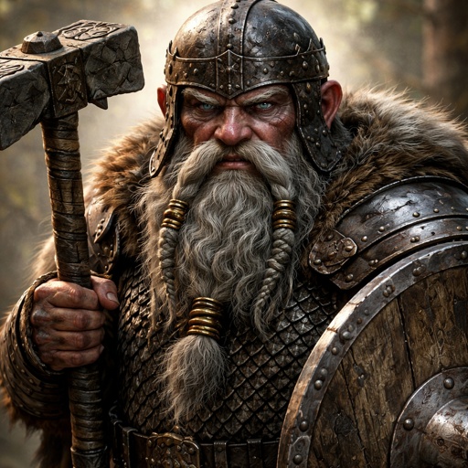 Grey dwarf with scale mail armour and half shield carrying a war hammer
