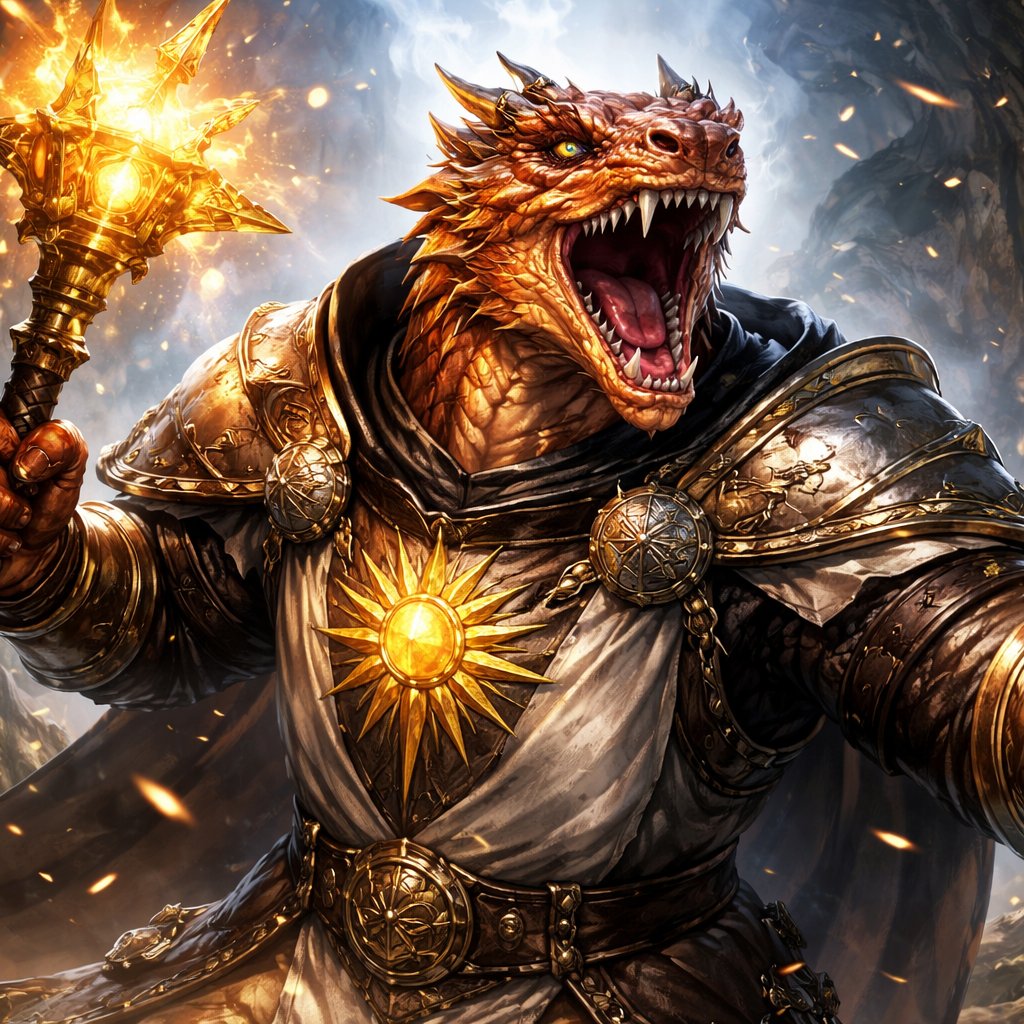 Green Dragonborn dorsal sail, bald, blue eyed, Cleric, fanged maw, Warpreist