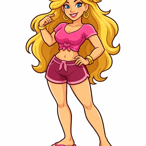 The goddess Aphrodite with a Roman wreath that’s gold, and wearing a pink shirt and dark pink beach shorts with pink fli...