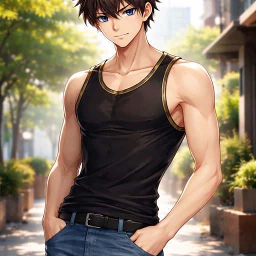 Guy with dark blue eyes and dark brown hair with gold lines a a black tank top and jeans