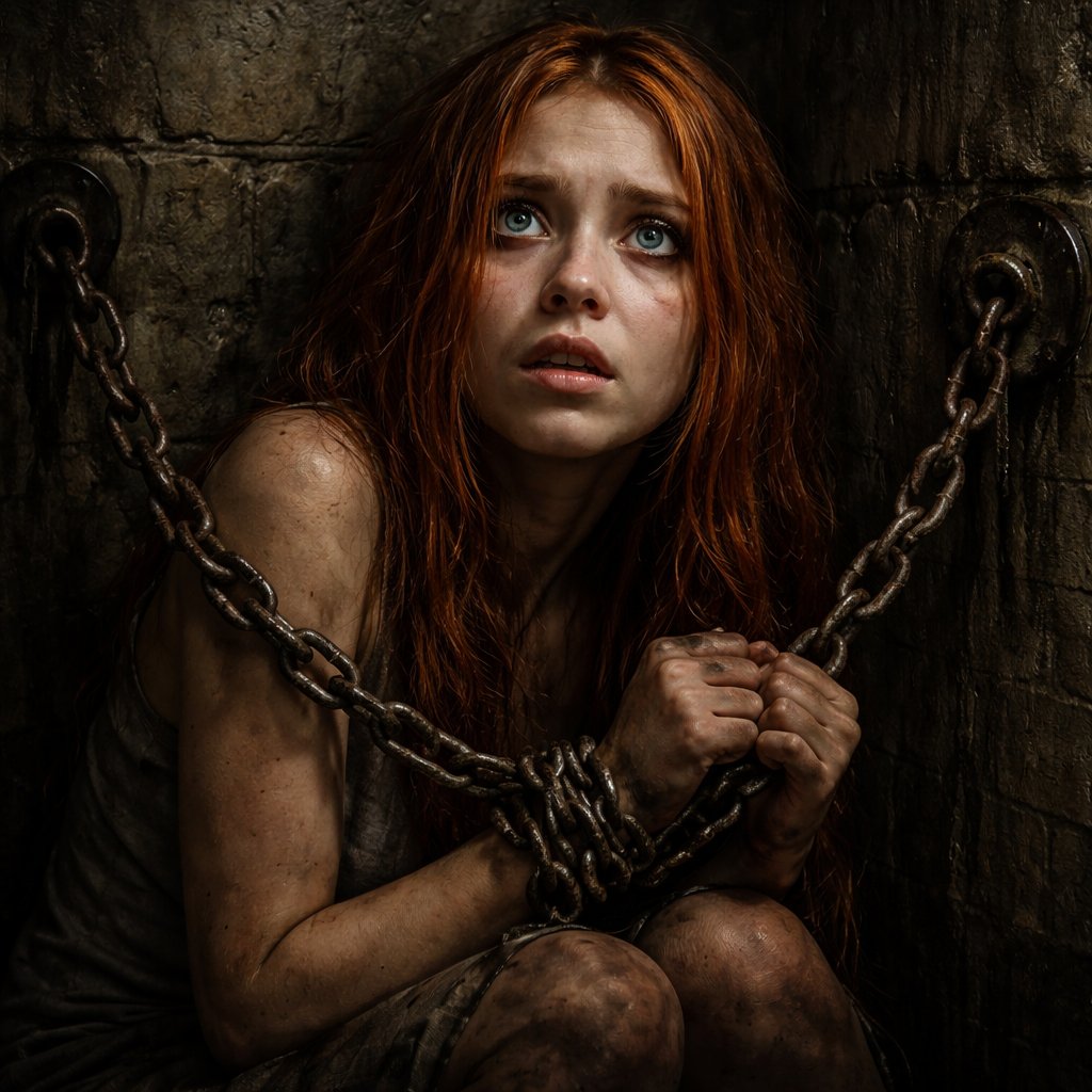 A red haired girl with one green eye and burn scars on half her face and one blind eye