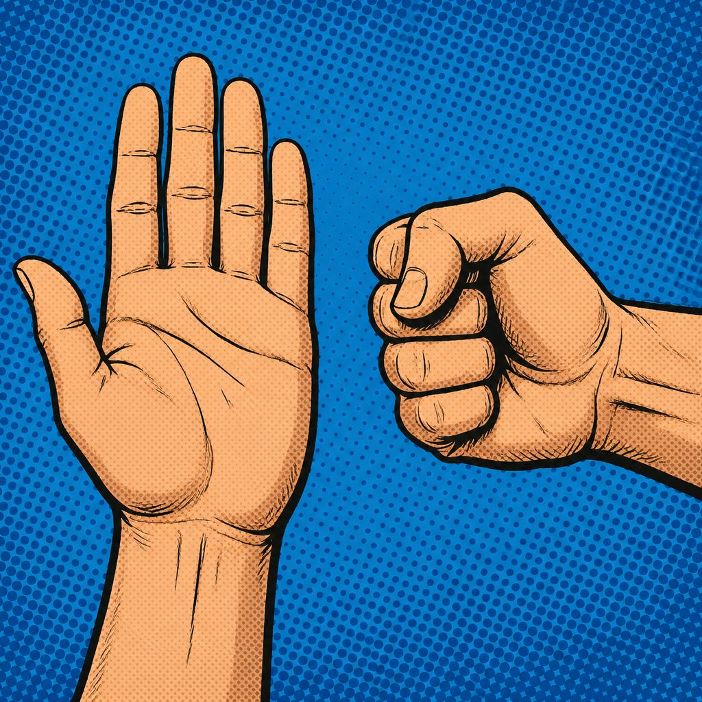 No caricatures, no speech bubbleleft hand open palm, flat view, flesh, color, right hand, heavy lines