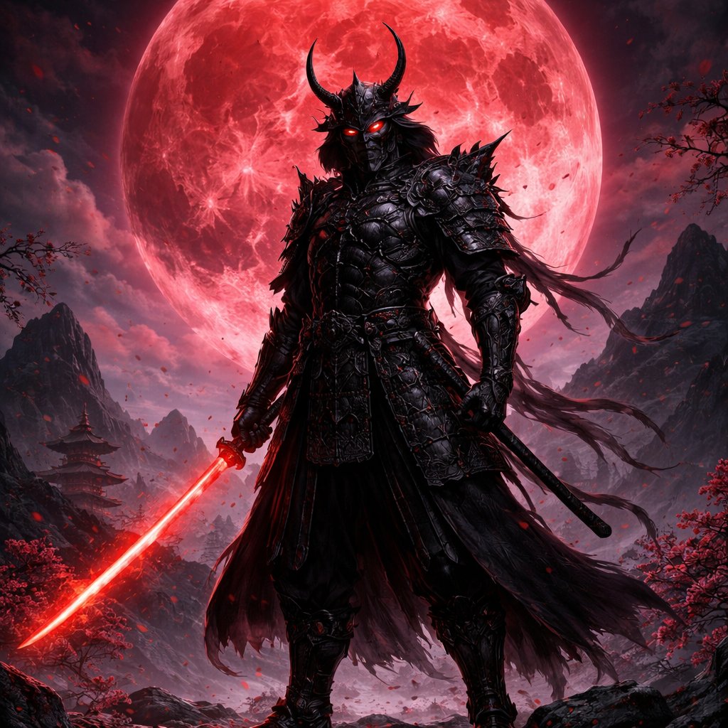 16, male, white hair, red eyes, wearing ragged black clothes with a tight top and baggy bottoms, crouched on a Japanese ...