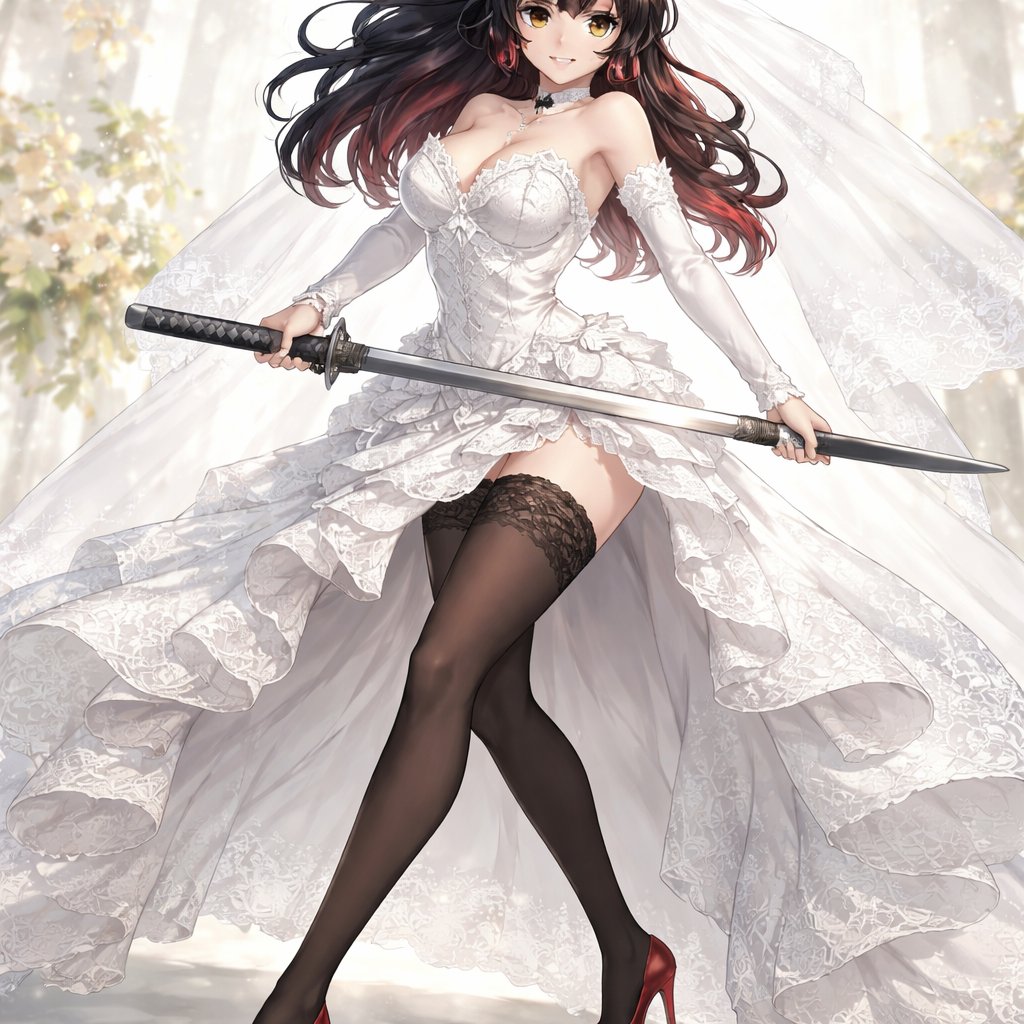 Cinder Fall in a lacy wedding dress, stockings, and high heels. And she is wielding a katana