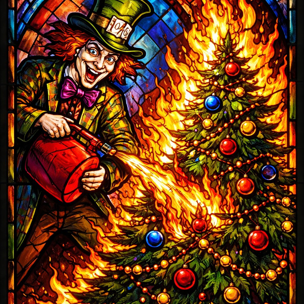 Mad hatter burning a Christmas tree