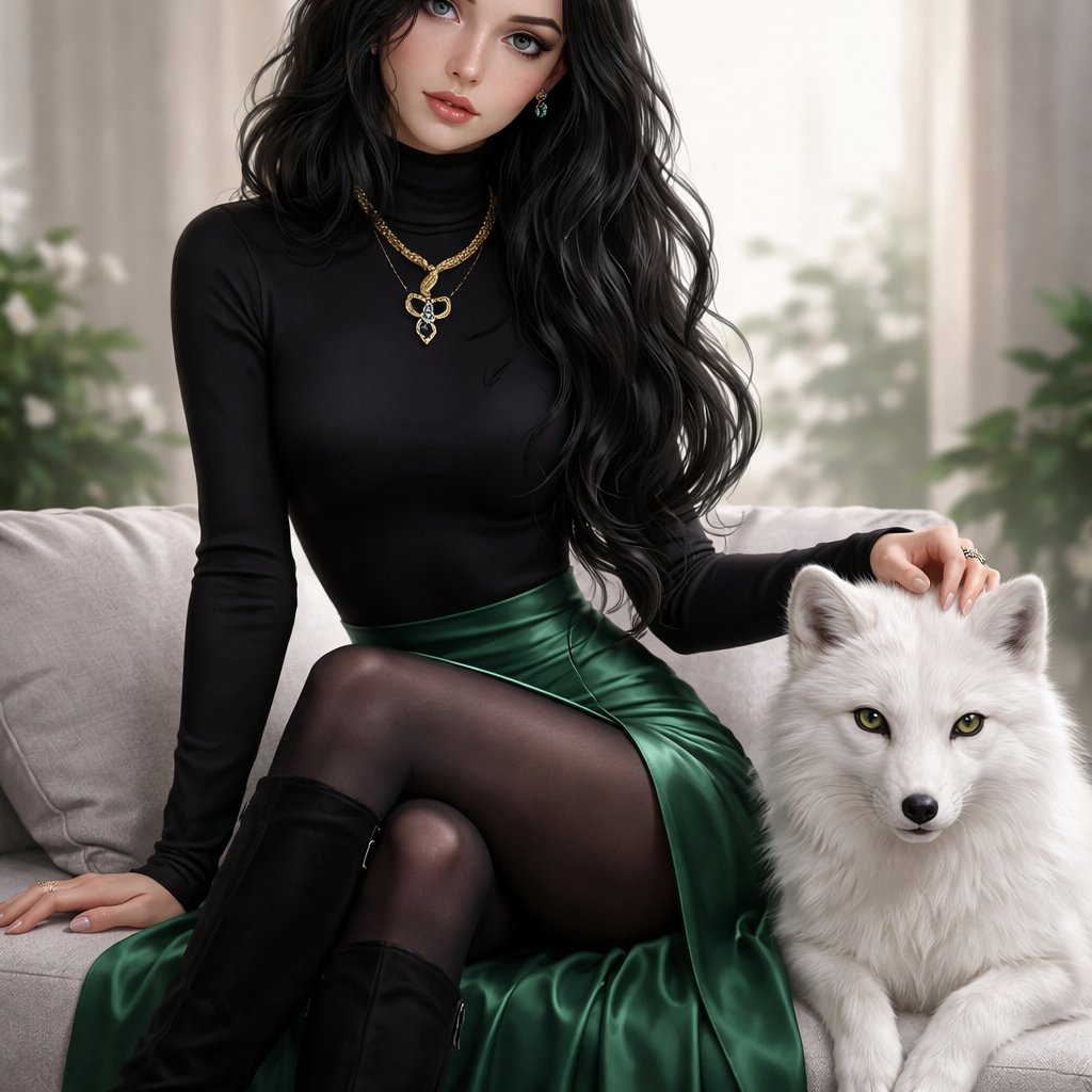 A teenager girl sitting with long black hair and grey eyes. Her hair is set in soft waves resting just above her but. Her eyes are storm grey. She is wearing a black long sleeve turtleneck and a satin Green skirt black tights and black thigh high boots. She has a small golden necklace of a snake and a silver ring with a b on the top to the left of the b is a black diamond and to the right is an emerald. She has an arctic fox next her with bright green eyes. She has fare skin and she has emerald stud earrings in both ears you can see her full body and she had a green satin headband matching her skirt