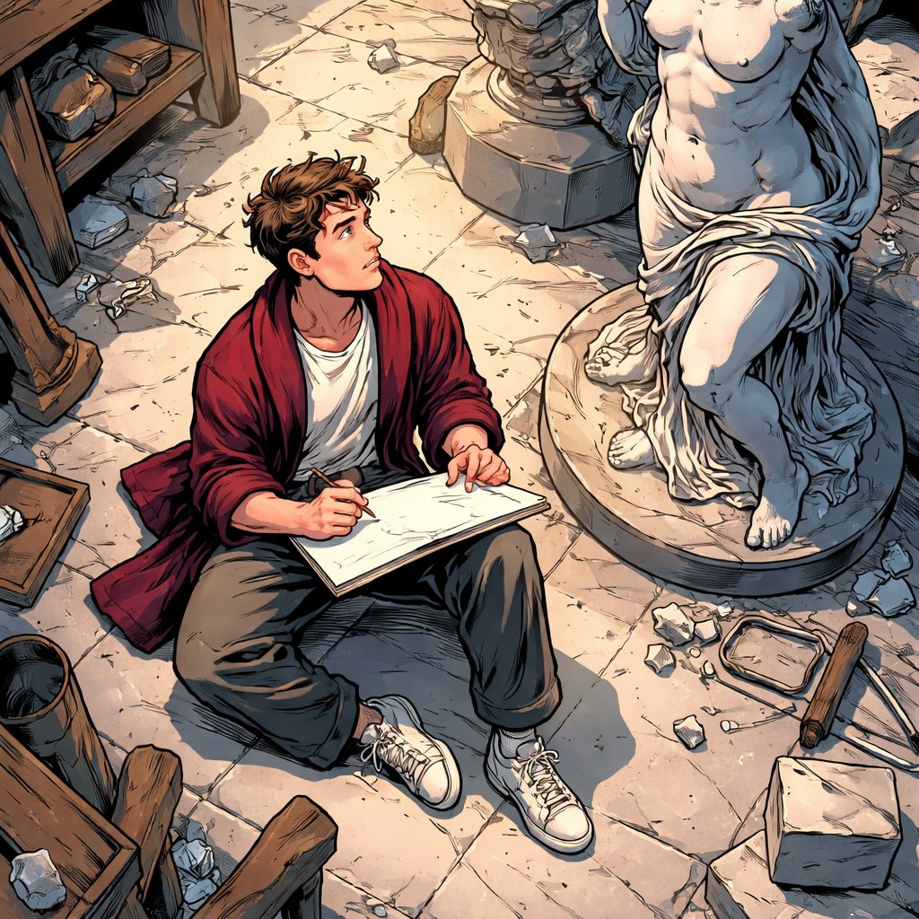 Realistic, refined, no caricature rich color, no speed bubbles a young man in his 20s in a robe is sitting with a drawing pad looking up at a sculpture drones view 3/4 from the front full body long shot.