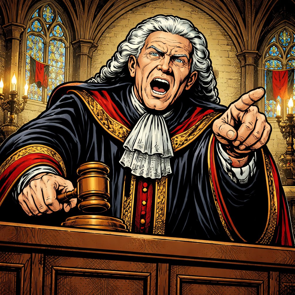 A very old judge with gray hair and extravagant robes and is Caucasian. His mouth is open as if speaking the background is like a mediaeval courtroom no speech bubbles no other people