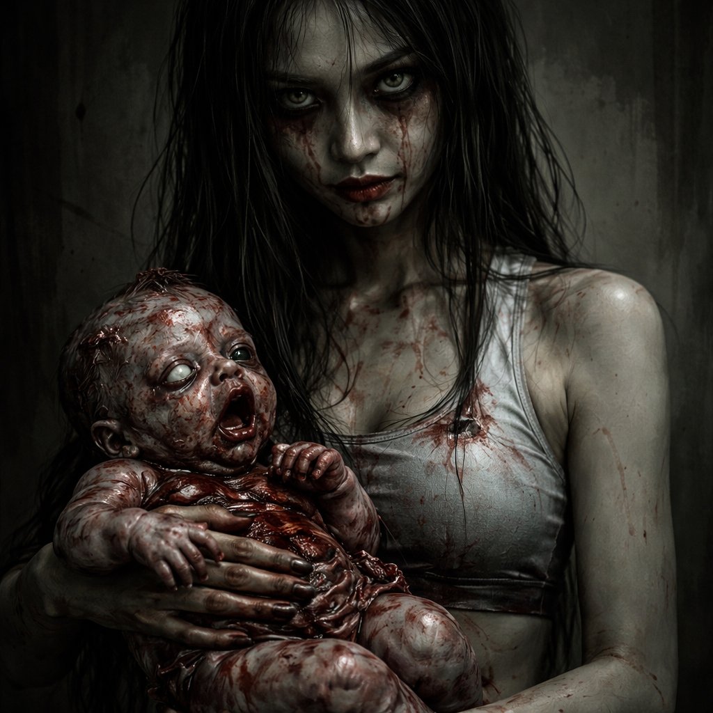 Hot Asian girl in a sports bra holding a baby