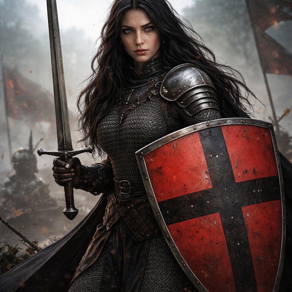 A female midevil soldier in heavy chain armor and black long hair with a red shield with a black cross on it and a sword...