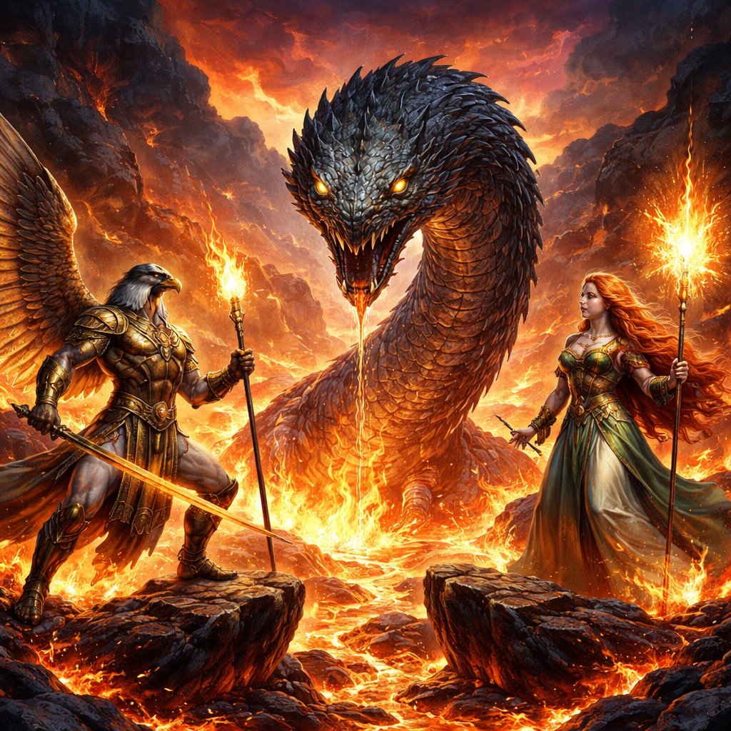 Horus and Brigid led trial in a volcanic march land against the hydra starting with only one head
