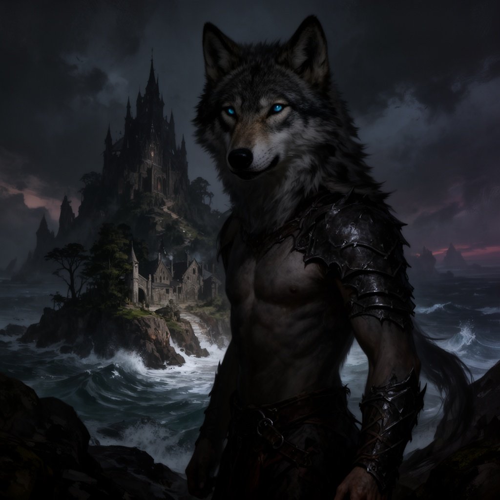 A island boy half man wolf, body of a human but with a head of a wolf, not just any wolf The Alpha Wolf