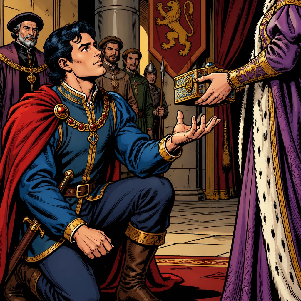A prince Neil‘s and receives a gift in his left hand his palm is open, and his fingers are open renaissance style