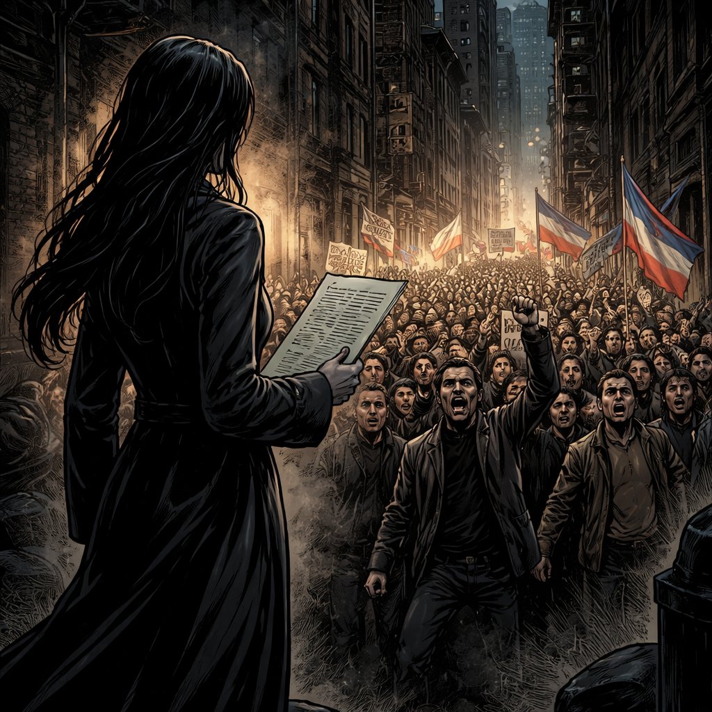 Realistic, refined, no caricature no speech bubbles on the right side we see a large, angry crowd, waving flags and banners on the left 3/4 from the rear is a tall, slim woman with long black hair in a robe her hand is extended holding a document we see your 3/4 from the back it is dark in the alleyways of the city.