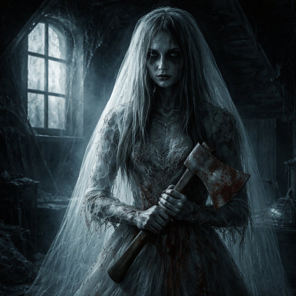 Ghost bride with an axe in an attic