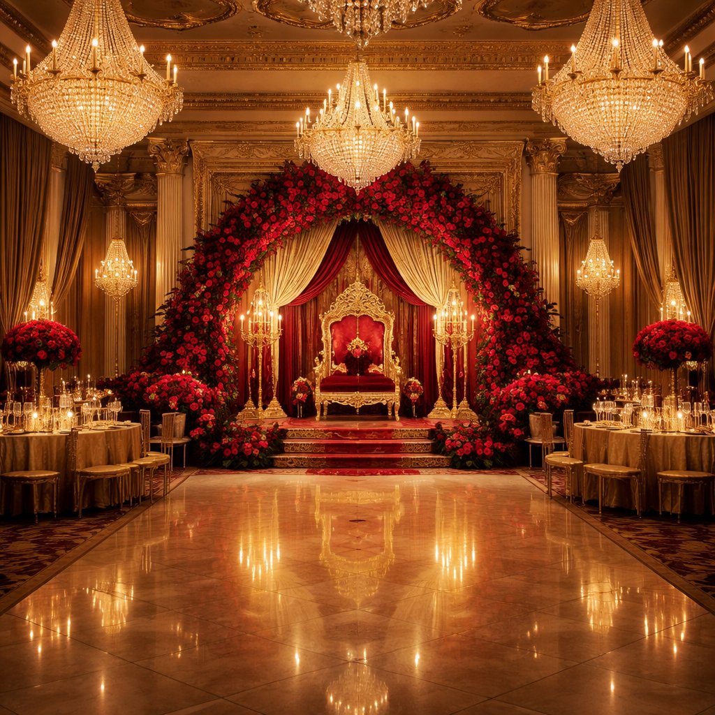 A ballroom with red roses and chandeliers