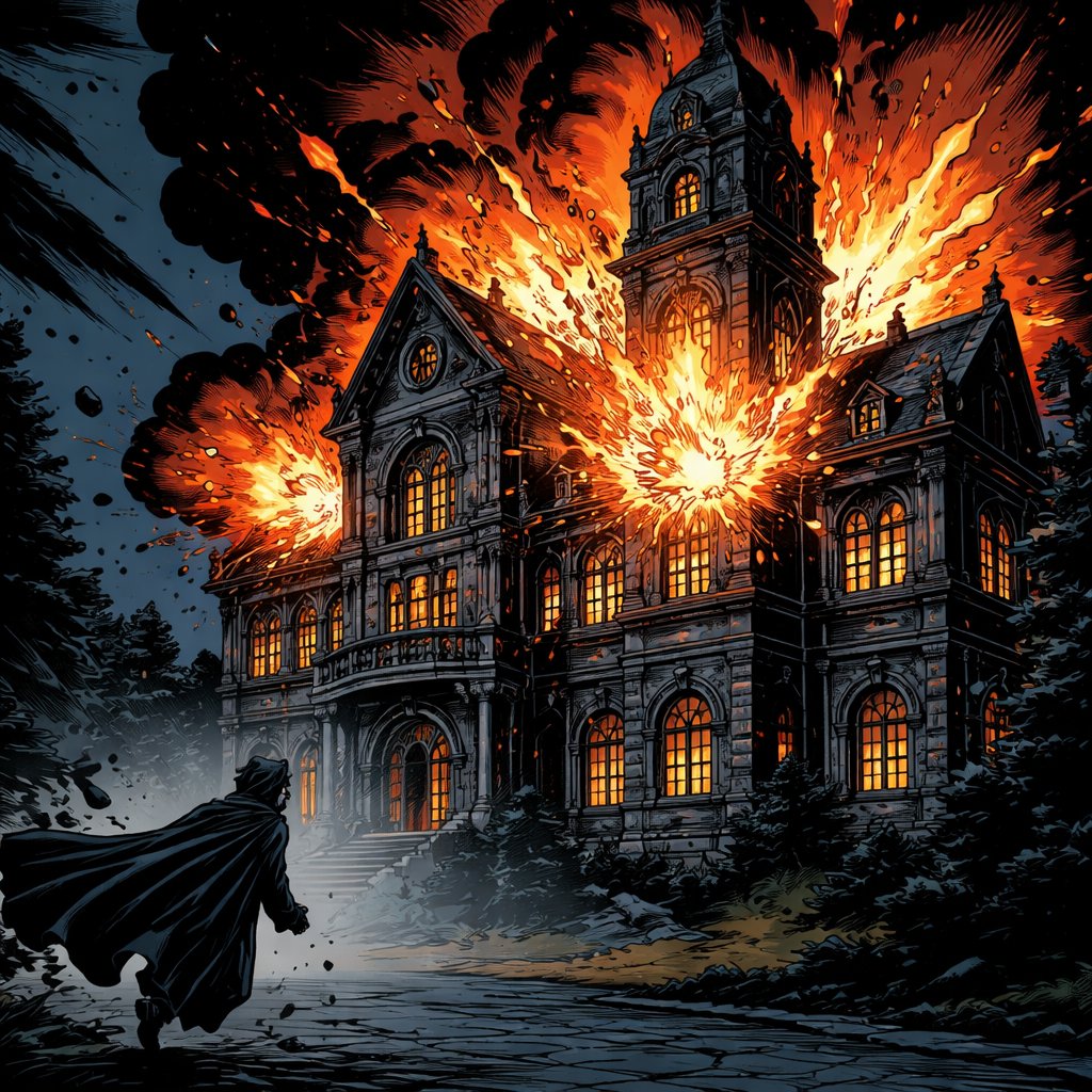 Realistic refined, no speech bubbles. it is dark night, an old-fashioned building explodes we see a tiny finger in a black robe, leaving the scene lower left the focus is on the burning building, mysterious atmosphere.
