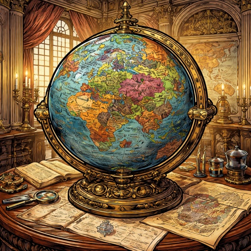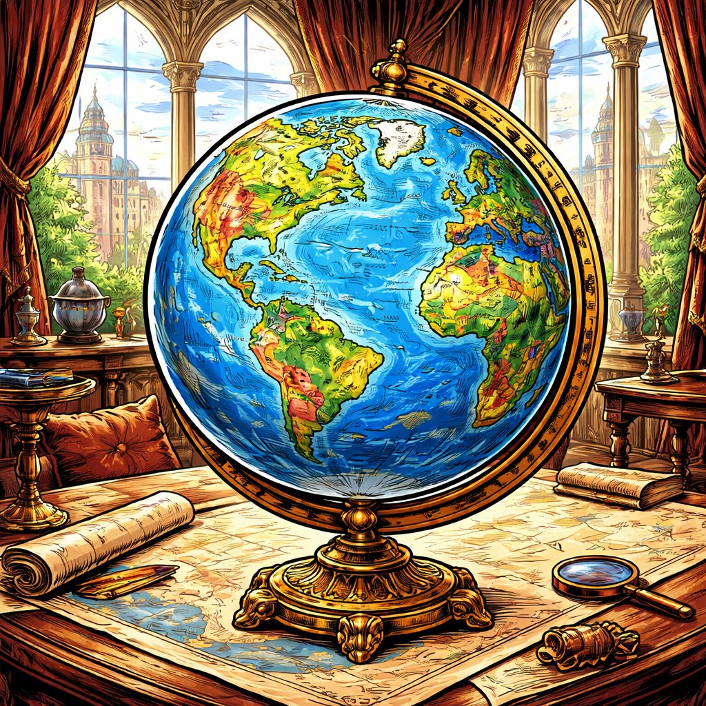 Realistic refined a large, ornate globe of imaginary continents on a large table. Full view of globe. Renaissance backgr...