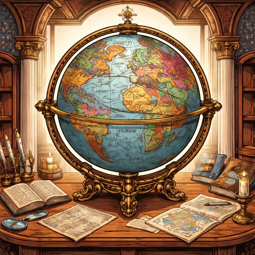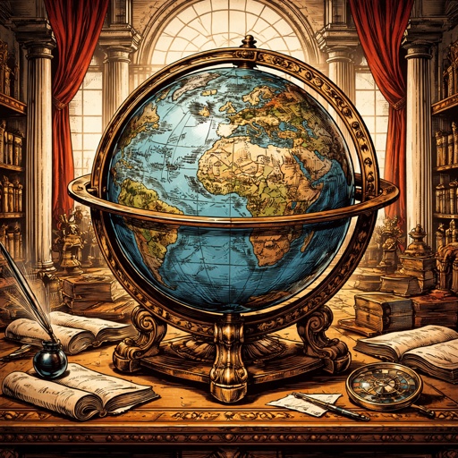 ornate globe of fake countried on a large table. Full view of globe. Renaissance background and style