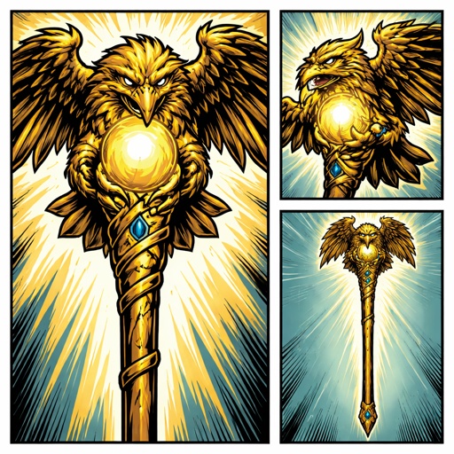 Three views of a staff made him gold with a large golden eagle on top. The eagle should be fierce.