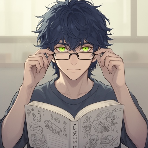 My description: I’m only 20 years old boy and I have these light lime green eyes, messy long darkish blue hair, long gla...